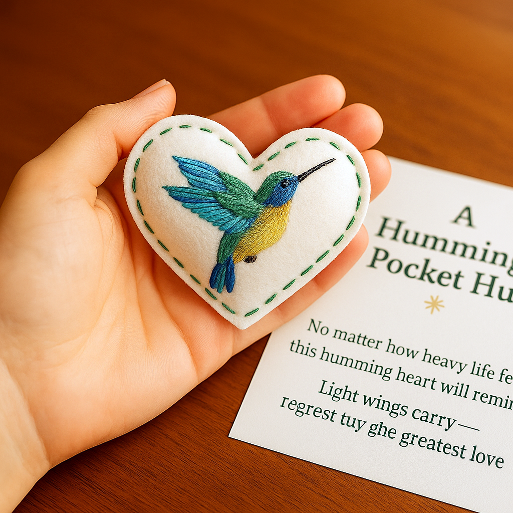 🕊️ Shaped like a heart and delicately embroidered with a hummingbird in flight, this small token reminds us that even the tiniest wings can carry the greatest love.